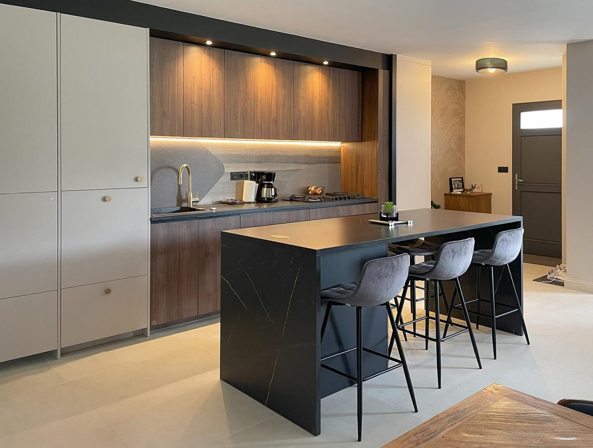 L'alliance du bois et du noir mat dans la cuisine crée une ambiance moderne et chic, l'îlot central est fonctionnel avec des rangements optimisés et des éclairages intégrés.